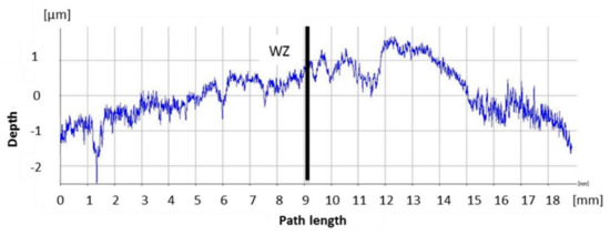 Figure 15 shows the depth topography graph of the corroded surface of weld W1. In the scanned IFM image at the top of the figure, the flow lines of the weld microstructure can clearly be seen after the specimen had been rinsed in running water. The position of the weld line is indicated by the thick vertical line in the below topography graph that was recorded along the thick line in the IFM image. A relatively even and symmetric corrosion attack is seen to have taken place within the entire weld zone (the base metal begins about 9 mm on either side of the weld line). The corrosion depth is seen to be in the range 1–3 µm with some deep pits.
