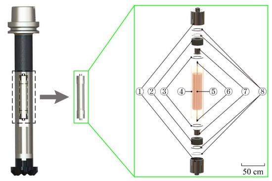 The milling tool embedded with a tuned mass damper (TMD). 1—end cover; 2—damping element; 3 and 8—gasket; 4—shell; 5—mass block; 6—steel rod; 7—support block.