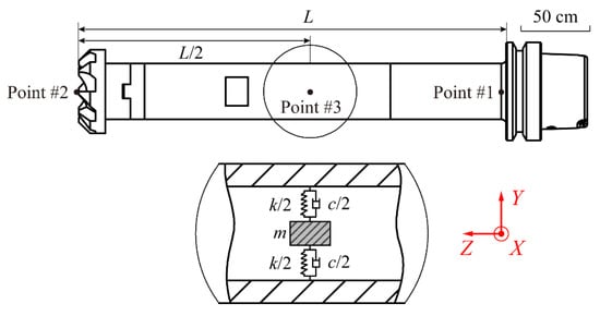 In order to obtain the tool-tip dynamics for cutting stability prediction, dynamic modeling of the milling tool embedded with a TMD is performed in this section. The schematic of the milling tool coupled with the TMD is shown in Figure 2. The TMD is attached with the milling tool at the midpoint of the arbor. It should be noted that ineffective parameter design of the TMD or inaccurate prediction of cutting stability may be caused if the milling tool is simplified as an SDOF model at the coupling position, which neglects the difference between the coupling position and tool-tip point in the dynamic model. Therefore, the current study employs a continuous model and predicts the tool-tip dynamics using receptance coupling substructure analysis (RCSA), with the effect of the rotating tool considered.