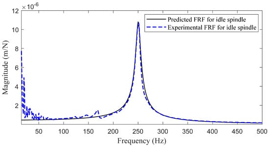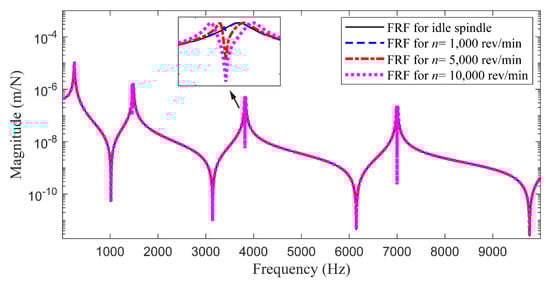 Based on the above model, the predicted tool-tip FRFs (H22SHT) of the idle milling tool in the frequency range of 10–500 Hz are shown in Figure 3, and the experimental FRF, whose frequency resolution is 1 Hz, is also presented for comparison purposes. It is found that the predicted FRF fits well with the experimental result. Consequently, the FRFs of the milling tool at different spindle speeds are simulated (Figure 4). It can be seen that four vibration modes appear within the frequency range of 0–10,000 Hz. Meanwhile, the rotation of the milling tool has a limited effect on the low-order vibration modes compared to the high-order modes. Specifically, the gyroscopic effect leads to the separation of the 2nd, 3rd, and 4th modes in the rotary status, and each mode is divided into a forward mode and a backward mode. As the spindle speed increases, the separated two modes deviate from each other. Furthermore, caused by the bending of the tool and spindle system, the 1st mode at 250 Hz has the maximum vibration amplitude and therefore dominates the cutting stability. Although the gyroscopic effect seems to have little influence on the 1st mode, its effect on other modes is unneglectable and further affects the critical depth of cut during milling operations [].