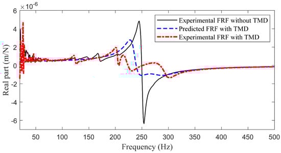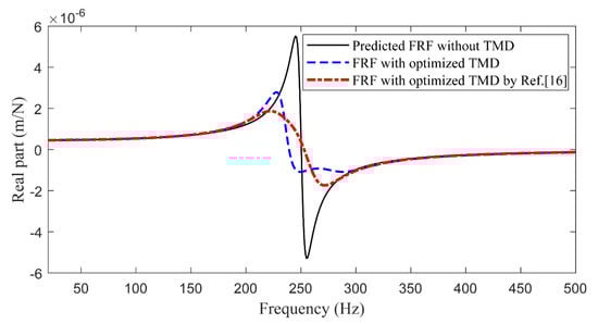When the TMD is optimally tuned based on the converged value given in Figure 5, the tool-tip FRF of the milling tool is plotted in Figure 6. The minimum real part of the tool-tip FRF is enhanced by 79.5% with the utilization of TMD, compared to that without TMD. Meanwhile, the FRF with TMD optimized based on the identified modal parameters of the target mode in [] is presented, in which the effect of background modes is neglected. It can be observed that a 12.4% greater increase of the minimum real part is achieved by using the method proposed in the current study, compared to the method using the discrete model.
