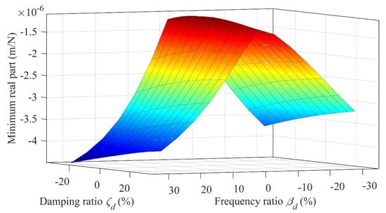 In order to examine the TMD’s performance when detuning occurs due to the unavoidable manufacturing and tuning errors, a robustness analysis of the TMD’s performance against its parameter variation is simulated. βd and ζd are tuned to deviate from the optimum values, and it is assumed that βd and ζd detune independently within the range of −30% to 30%. Figure 7 shows that the performance of the TMD significantly deteriorates as βd deviates from the optimum value, while the minimum negative real part of the tool-tip FRF is less sensitive to damping ratio uncertainties. Moreover, it is observed that when βd is tuned away from its optimum, the negative real part enhances with the increase of ζd. In contrast, the increased ζd results in the reduction of the negative real part of FRF for optimally tuned βd. Furthermore, the TMD achieves the worst performance when βd and ζd deviate −30% from the optimum values, and the minimum real part is increased by 29.0% more than that without TMD. As the minimum real part can still be enhanced even when the TMD parameters deviate from the optimum values by 30%, the proposed milling tool with TMD is expected to have an effective chatter-resistance ability in practical milling operations.