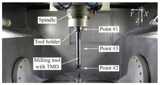 Tap tests were first carried out to examine the optimization strategy and the effectiveness of the TMD in improving the frequency response at tool-tip. The frequency of the TMD was tuned to the optimum value, according to Section 3.1. With an overhang of 310 mm, the milling tool embedded with TMD was clamped on the tool holder of the milling machine XKR50A, as shown in Figure 8.