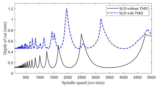 After identifying the cutting force coefficients using Altintas’s method [], the SLDs were calculated for slotting processes on the material aluminum 7075-T6. The predicted FRF with TMD when n = 5000 rev/min was utilized for SLD prediction (Figure 4). The SLDs for the milling tool without and with TMD are shown in Figure 10. For the milling tool without TMD, the minimum critical depth of cut was predominantly attributed to the mode at 250 Hz, and it was enhanced from 0.10 to 0.46 mm with the utilization of TMD. Meanwhile, as the dominant mode of the milling tool was split into two modes when employing the TMD, the minimum stable cutting depth was determined by the modes at 228 Hz and 266 Hz for the milling tool with TMD.