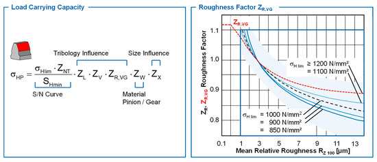 For gear grinding, vitrified bonding systems are widely used, due to their good profileability and high dimensional stability. Furthermore, vitrified grinding tools have a high hardness, which is defined as the strength with which the abrasive grain is held by the bond [8]. The hardness prevents the early breakout of the grain from the bond and it holds the abrasive grain in place during the engagement with the workpiece. Besides vitrified bonds, metal bonds are available, which are characterized by a particularly high hardness [9]. However, the disadvantage of metal bonds is the lack of profileability. With elastic bonds, including synthetic resin and polyurethane bonds, produce low roughness depths on the workpiece surface. However, elastic bonds only have low dimensional stability, which can have a negative effect on the geometry during the process [10]. The reduction of tooth flank roughness by means of grinding is particularly beneficial for increasing the tooth flank load-carrying capacity [11]. Furthermore, with a reduction of the tooth flank roughness, the efficiency of gearboxes could be increased [12]. The required roughness in the range of Rz < 1 μm cannot be achieved with conventional grinding tools that are made of vitrified corundum in many cases. Gears are post-processed after hard finishing in order to achieve the required roughness. Chemically assisted vibratory grinding, as well as polish grinding with elastic bonded grinding tools, are commonly used for super finishing. For chemically assisted vibratory grinding, a significant potential for increasing the load-carrying capacity was identified. From the results of the running tests, a new factor for calculating the maximum stress of the flank in accordance to DIN 3990 was derived [11,13]. The roughness factor ZR can be extended to the roughness factor ZR,VG. It was assumed that no further increase in load-carrying capacity could be achieved with a further reduction in roughness, as in Figure 1 [13]. Further scientific investigations have shown that a lower roughness can lead to a further increase in the load-carrying capacity [14].