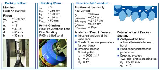 For the investigations, a profile and generating gear grinding machine from Kapp Niles GmbH of type KX 500 FLEX was available. The grinding tests were performed on an automotive pinion shaft with a number of teeth of z = 26, a normal module of mn = 1.76 mm, a pressure angle of αn = 15°, and a helix angle of β = 33.75°. This gear represents a typical industrial application for polish grinding, see the left side of Figure 2.