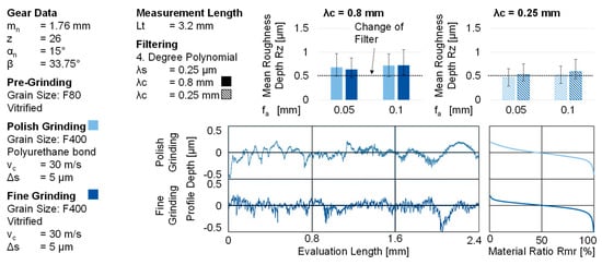 Roughness measurements were carried out with a tactile roughness measuring device of the type Marsurf LD260 from the company Mahr in order to evaluate the influence of the used parameters and grinding worm specifications. The filters for the evaluation of the roughness profiles were selected according to DIN EN ISO 4288 [18]. In a range of the mean roughness depth of Rz = 0.5–10 µm, a waviness filter with a cut-off wavelength of λc = 0.8 mm has to be used according to the standard [18]. For a lower surface roughness with a mean roughness depth of Rz = 0.1–0.5 µm, the standard requires a change of the cut-off wavelength of the waviness filter to λc = 0.25 mm. A measurement with λc = 0.8 mm has first to be carried out in order to select the cut-off wavelength. If the mean roughness depth is below Rz < 0.5 µm, then the roughness must be re-evaluated with a cut-off wavelength of λc = 0.25 mm. Because the surface roughness of fine and polished surfaces was expected to be in the range Rz < 1 µm and, thus, close to the change of the cut-off wavelength, the influence of the choice of the cut-off wavelength was first evaluated. In Figure 3, the mean roughness depth for one test of both a polish and fine ground surface is shown. The mean roughness depth Rz was first evaluated with a waviness filter with λc = 0.8 mm and, subsequently, with a waviness filter with λc = 0.25 mm. In the lower part of the image, a roughness profile and the corresponding Abbott curve of a polish and fine ground tooth flank are shown.