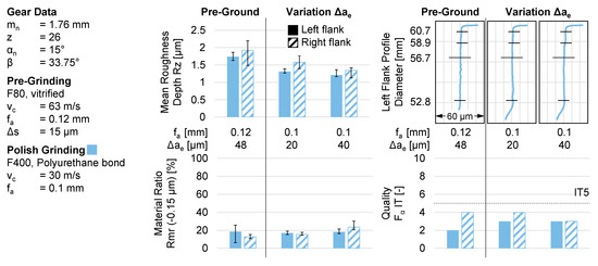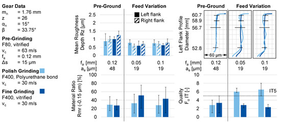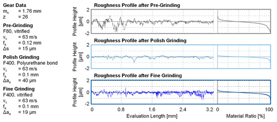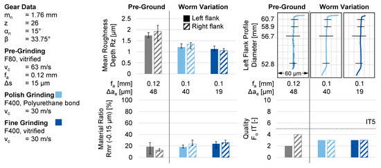 Besides the constant pre-grinding process parameters, the process parameters, respectively, the process strategy, was only adjusted for the polish grinding process. Therefore, the relative infeed was set to Δae = 40 µm for polish grinding. The fine grinding process was kept constant compared to the first test with the dressing disc with an infeed of Δae = 19 µm. The axial feed and the cutting speed for both polish and fine grinding was set to fa = 0.1 mm, respectively, vc = 30 m/s. In Figure 7, the results of pre-ground, polish, and fine ground gears are shown. The grinding worms were dressed with a two-flank dressing tool with standard industrial dressing parameters. After pre-grinding with a grain size of F80, the mean roughness depth is approximately Rz = 1.9 µm and the material ratio is approximately Rmr(−0.15 µm) = 20%. The profile is within the tolerance and the worst measured profile qualities are Fα,left IT = 2 and Fα,right IT = 4. The achieved mean roughness depth with the polish grinding process is approximately Rz = 1.3 µm. While using fine grinding, a mean roughness depth of Rz = 1.1 µm can be achieved. The material ratio Rmr(−0.15 µm) is only slightly increased by the use of polish or fine grinding process as compared to the pre-ground gears. The profile and profile quality are not affected negatively by fine or by polishing grinding. Therefore, the profiles are almost identical to the pre-ground variant and quality Fα changes to IT = 3 for both the polish and fine ground gears.