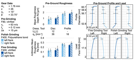 In the following, the influence of different dressing tool technologies is analyzed by means of the achieved roughness after pre-grinding, as well as the pre-ground profile and lead. The roughness after pre-grinding with a grain size of F80 is evaluated by means of the mean roughness depth Rz and the arithmetic mean roughness Ra, left side of Figure 5. After pre-grinding with the conventional grinding worm with a grain size of F80 dressed with a dressing disc, the roughness is approximately Rz = 1 µm, respectively, Ra = 0.13 µm. By using an industry standard two-flank profile dressing tool with industry standard dressing parameters, the roughness is approximately Rz = 1.9 µm, respectively, Ra = 0.29 µm. On the right side of Figure 5, the profile and lead of the left and right flanks of two pre-ground gears are shown. The profile and lead correspond to the specifications of the technical drawing. The visible lead angle deviation is part of a modification of the gear used and, therefore, is not an error.