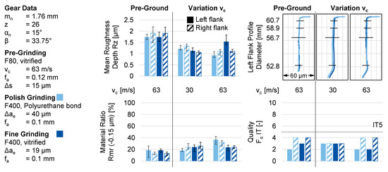 In the first test series with the dressing disc, the cutting speed for polish and fine grinding was set to vc = 30 m/s. In the tests with the industrial standard dressing tool, this cutting speed was kept constant. In industrial grinding processes, higher cutting speeds are necessary in order to increase the productivity. Therefore, the cutting speed has to be increased to an industrial standard of vc = 63 m/s, and the dressing tool was changed to an industrial standard two-flank profile dressing tool. For this reason, the influence of the different cutting speeds used for polish and fine grinding on the roughness, and the profile quality has to be investigated. Therefore, gears are polished and fine ground with grinding worms dressed with the used industrial standard dressing process. Because of the different used cutting speeds and, therefore, the different rotational speeds, the deformation of the elastic polyurethane bonded grinding worm is also expected to be different. For this reason, the first step for the polish grinding process is to determine the infeed of initial contact between grinding worm and gear, according to Equation (1). Subsequently, the relative infeed is set to Δae = 40 µm while using the polish grinding worm for both cutting speeds. The relative infeed of the vitrified fine grinding worm equals the infeed, and it is set to Δae = 19 µm for both cutting speeds. The results of the cutting speed variation are compared in Figure 8 for both polish and fine grinding.