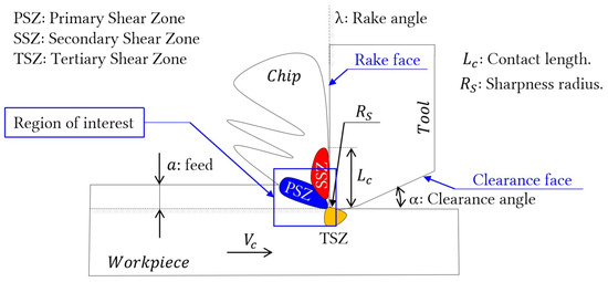 Currently, numerical simulation results are compared with the experimental ones at the macroscopic level [5,6,10,11,12] through (i) force components measurements, (ii) post-mortem analysis giving the chip morphologies, its geometrical characteristics [13], and with an SEM (“Scanning Electron Microscopy”) analysis [14,15,16,17,18], (iii) in-situ measurement of the tool-chip contact length [7,19,20], and (iv) temperature measurement at the tool tip using inverse methods [9,21,22,23].