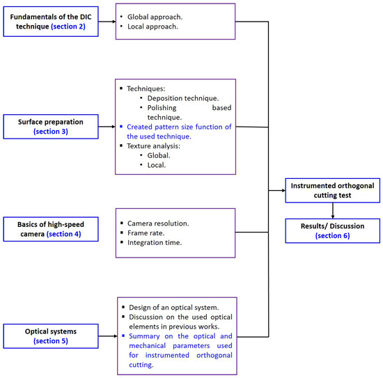 Figure 2 shows the synoptic scheme of the article. First, the fundamentals of the DIC technique are given in Section 2. Section 3 gives details on techniques that are used for surface preparation of the workpiece for DIC post-processing. These techniques are discussed and classified in terms of the created pattern size. Tools for texture analysis are presented. Subsequently, Section 4 gives basics and analyzes high-speed camera fundamentals. The definition of each optical parameter is given and methods for identifying the appropriate optical parameters are presented. Section 5 gives details on the previously designed optical systems. Optical and mechanical parameters that are used for instrumented orthogonal cutting are summarized at the end of this section. Following this order and after instrumented orthogonal cutting tests, this paper ends with Section 6, giving the results of kinematic fields measurement during orthogonal cutting [24,43,47,49] and discussing the application of the DIC technique.