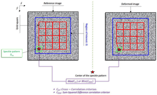 The DIC technique is used to measure the displacement and strain fields that are based on images post-processing. Two images, denoted by the reference and the deformed images, are required. A region of interest (ROI) is selected in the reference image and discretized into N × N square subsets or speckle patterns. Each speckle pattern must contain enough of an intensity gradient (or grey level intensity variation) to ensure a unique correspondance in the deformed image. During the matching procedure, each speckle pattern in the reference image is used to track its location in the deformed image.