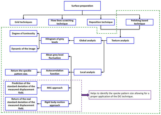 Texture analysis helps to determine the speckle pattern size allowing for the application of the DIC technique for the displacement field measurement. This section describes texture analysis that is based on images processing on surfaces that were prepared either by deposition techniques or “polishing based” techniques.