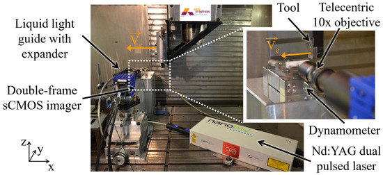 During machining, images from the cutting zones are recorded while using a specific optical systems. The choice of the magnification lens is usually made with respect to the size of the region of investigation. The ROI does not exceed 1 mm when observing the PSZ and 2 mm when observing the subsurface of the workpiece [24,25]. For example, in the case of orthogonal cutting on Ti-6Al-4V, it was found that, in the range of cutting speeds between 3 and 30 m/min., the frame rate allowing for obtaining sufficient images of one segment chip formation is in the range of 6000 to 50,000 fps [48,49]. Therefore, the choice of the high-speed camera should be made, so that it allows capturing with frame rates ranging between 6000 and 50,000 textitfps. In this case, the inter-frame time ranges between 20 μs and 100 μs. Otherwise, a dual-frame camera allows for considerably reducing the inter-frame time to 120 ns [24,38].