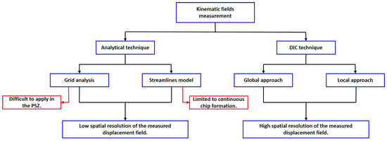 Figure 15 summarizes the techniques used for kinematic fields measurement. For analytical technique and when using the grid distorsion analysis, it was found difficult to apply in the PSZ due to high distorsion. Moreover, the streamlines model shows to be limited to continuous chip formation. Numerous works demonstrated the efficiency of the DIC technique in kinematic fields measurements during orthogonal cutting tests [24,25,38,39,40,41,43,46,47,48,53,54,55,56,57]. In addition, It offers a high spatial resolution of the measured displacement field. Table 5 gives the magnitude of the measured plastic strain and strain rate within the PSZ with the corresponding cutting parameters.