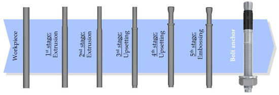 Cold forging is presented in this study using the example of a bolt anchor production of the company Fischer. In order to meet high performance requirements for economical anchoring solutions in cracked and noncracked concrete, as well as under seismic loads, the forming production of bolt anchors is carried out from a cylindrical semifinished product. The entire production of a tapered bolt, which is considered as a template for a demonstrator component, follows the five-stage process sequence shown in Figure 1 [19]. In the first stage, the manufactured semifinished product is tapered at one end of the cylinder with the aid of a cold extrusion. Similarly to the first stage, further tapering of the workpiece takes place in the second stage. In the third stage, material is accumulated by upsetting the balance between the tapered and untapered workpiece areas, creating the first end stop for the expansion clip. In stage four, further upsetting of the tapered area at the end of the workpiece takes place, which as a result causes the second stop to be formed. In the final process stage, a label is applied to the bolt surface by embossing.