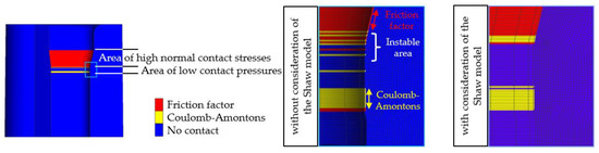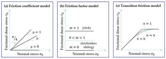 The friction factor model is usually used for high contact normal stresses, because at low contact normal pressures this model may inaccurately represent the frictional resistance. For this reason, the definition of the combined friction model proposes a combination of the friction coefficient model and friction factor model, as shown in Figure 2c. A disadvantage of this model is, however, the existing discontinuity point in the transition between the friction coefficient and the friction factor model.