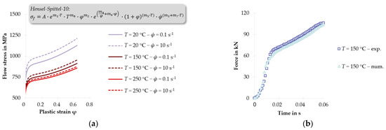 The resulting data from the testing machine were used to calculate the coefficients for the analytical flow curve approach called Hensel-Spittel-10 (see Table 1). For the determination of the material-specific coefficients , , , , , , , and , the algorithm of generalised, nonlinear optimisation with reduced gradient (GRG) was used [23]. Figure 3a shows the calculated temperature and strain rate dependent flow curves between RT and 250 °C. The temperature and strain rate dependent flow curves were validated by numerical simulation of the cylinder compression tests. The force–time curves and the geometry of the workpieces after the cylinder compression test served as validation criteria. As an example, Figure 3b shows a comparison of the experimental and numerical force–time curves for the cylinder compression test at T = 150 °C and a strain rate of 10 s−1 [24]. The force–time curves are in good agreement.