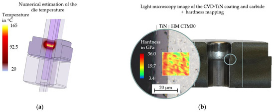 (a) Numerical estimation of the die temperature (b) light microscopy image to determine the thickness of the CVD TiN coating and hardness mapping of the coating by nanoindentation.