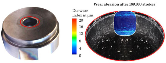 A number of 189,000 forming strokes was selected to ensure an examination of the dies at a point at which significant wear unequivocally occurs, but not total tool failure. After 189,000 forming strokes, a maximum wear removal in the area of the shoulder runout radius of approx. 12 µm was determined.