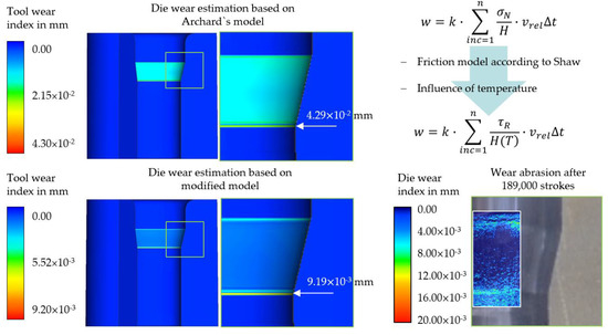 With the help of the number of forming strokes until the beginning of detectable wear and the material data determined in Section 3.2, it is possible to validate the extended wear model. The calibration of the wear factor k was performed using the extended wear model. To demonstrate the advantages of the modified wear model, the wear factor k described above was also used for the conventional wear model according to Archard. The respective simulation results are shown in Figure 6.