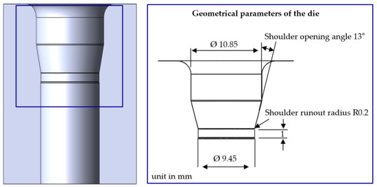 Die geometries can be fully described by the shoulder-opening angle, cross-section decrease, and shoulder inlet and outlet radii. Figure 8 shows the geometric dimensions of the rotationally symmetrical extrusion die currently in use.