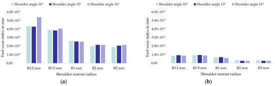 The respective maximum values of the simulations were determined analogously to Figure 6 and are shown as a bar chart in Figure 9. Regarding the initial geometry of the die, the conventional wear model according to Archard predicted the lowest wear at the currently used shoulder-opening angle of 13°. Using the modified wear model, this shoulder-opening angle shows the highest wear. Examining the influences for the further variations, both models show a similar trend. With increasing shoulder-runout radii, the predicted wear removal decreases. For the shoulder-runout radius R2 mm, wear can be halved with the Archard wear model. Taking into account the modified wear model, a reduction of 70% in wear removal is to be expected.