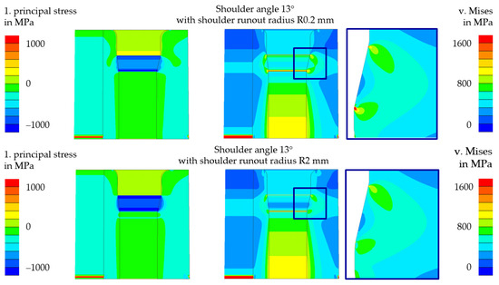 Figure 10 shows the resulting die stresses of the initial die (13° with R0.2 mm) compared to the die with the lowest expected wear removal (13° with R2 mm). The stress states shows the time at the maximum forming force required during extrusion. The results show that the differences between the forming forces are negligible (1%). It can be seen that the peak stresses at the shoulder-runout radius were reduced by increasing the shoulder-runout radius.