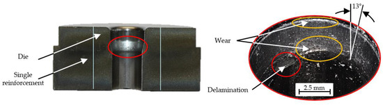 To compare the numerical results, a worn die after a tool change is shown in Figure 11. In addition to the known wear pattern, delamination of the coating at the shoulder outlet radius can be observed, which is due to the high stress peaks at the shoulder outlet radius.