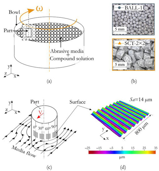 - Cariapa, V.; Park, H.; Kim, J.; Cheng, C.; Evaristo, A. Development of a metal removal model using spherical ceramic media in a centrifugal disk mass finishing machine. Int. J. Adv. Manuf. Technol. 2008, 39, 92–106. [Google Scholar] [CrossRef]