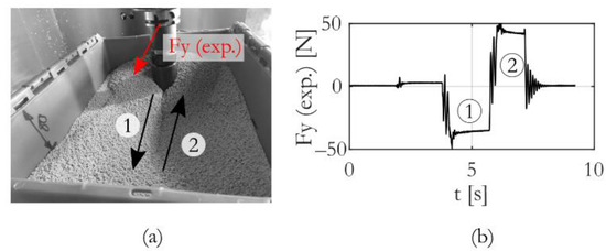 Figure 2a. The workpiece was dragged through the media that were placed in a large box, the black arrows show (1) the forward and (2) return directions). The resultant force (Fy (exp.)) applied on the workpiece was tracked, as shown in