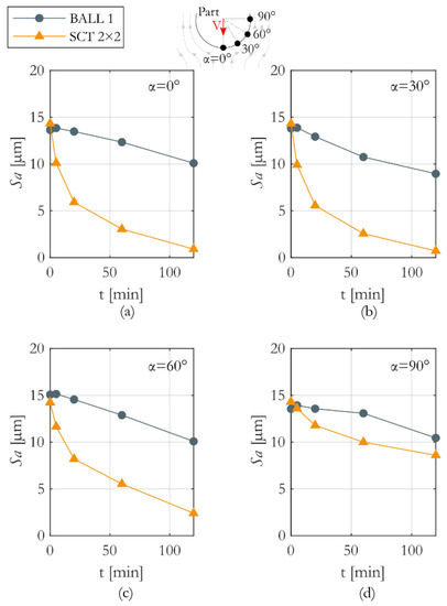 However, it is remarkable that the evolution of the surface roughness in the case of the spherical media is not strongly influenced by the surface orientation angle. At α = 30°, the Sa reduction at t = 120 min is slightly higher than for the other angles. This matches with the strongest shear stress value calculated numerically at the same orientation angle.