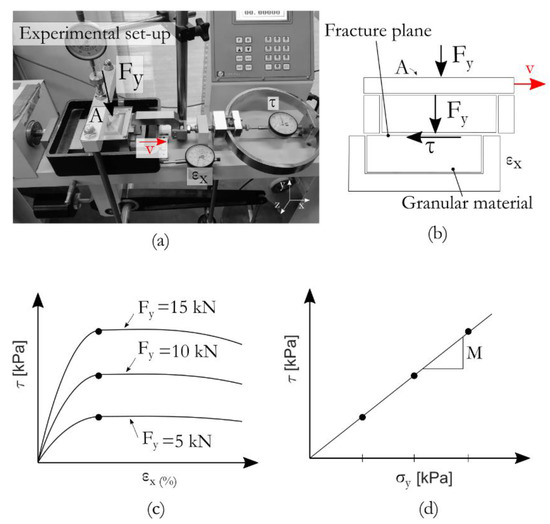 Figure 5a). This test relates the normal and tangential stress applied to the cell and gives the internal friction angle of the material. This friction angle is composed of the local friction between particle surfaces (µ) and the contribution of the interlocking (β) between particles due to their shape (Equation (1)).