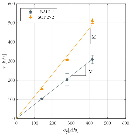 Both the normal stress σn and shear stress τ are higher with the pyramidal media. This observation is the direct consequence of the flow stress through the difference of the internal friction angle (φSCT-2×2 = 49° and φBALL-1 = 30°).