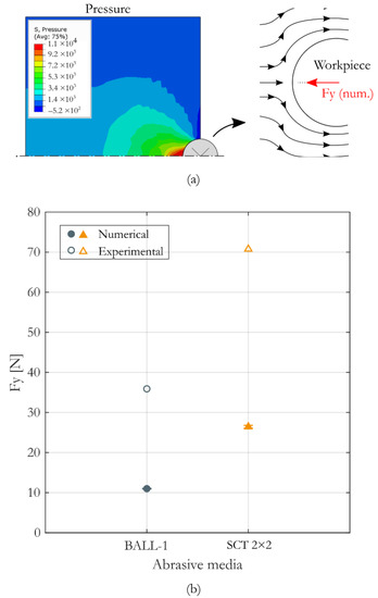 In order to reach a better understanding of the experimental results, a numerical model that simulated the flow of abrasive media around the cylindrical part was developed. A 2D model based on an Arbitrary Lagrangian–Eulerian (ALE) [