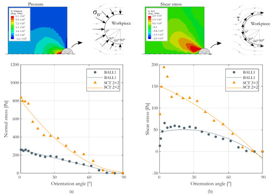 The stress distribution depends on the orientation angle of the surface. At 0°, there is a stagnation point of the media flow, where the normal stresses reach the maximum value. On the contrary, the shear stress is rather high, but somewhat under the values some degrees further. Outside of this stagnation area, the shear stress exhibits a peak of intensity. This peak is wide for the spherical media (between 5–30°), whereas it is narrower for the pyramidal one (between 5–10°). Then, both stresses decrease when increasing the orientation angle until reaching 90°, where their values are minimum.