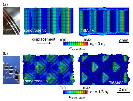 - Roopa Rani, M.; Rudramoorthy, R. Computational modeling and experimental studies of the dynamic performance of ultrasonic horn profiles used in plastic welding. Ultrasonics 2013, 53, 763–772. [Google Scholar] [CrossRef]