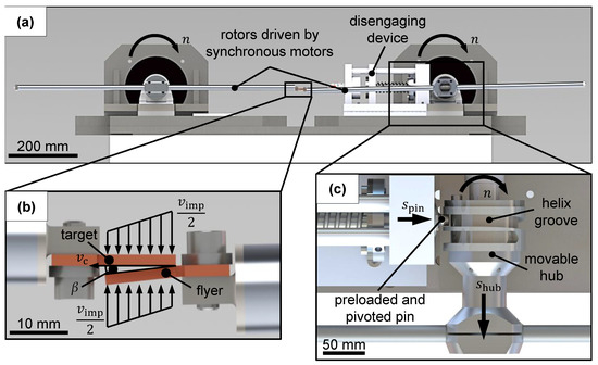 Therefore, a new mechanism for initiating the collision process was developed. The necessary offset of the samples was provided by a movable rotor hub which allowed an axial shift of 15 mm in the direction of the drive shaft during rotor acceleration, as can be seen in Figure 1c. At the desired turning speed, a preloaded, pivoted pin is released and engaged in a helix groove on the hub. Due to the defined motion by the cam gear, the hub’s axial offset could be compensated up to impact velocities of 523 m s−1. Moreover, the rotors could be made of solid aluminum alloy to increase the service life.