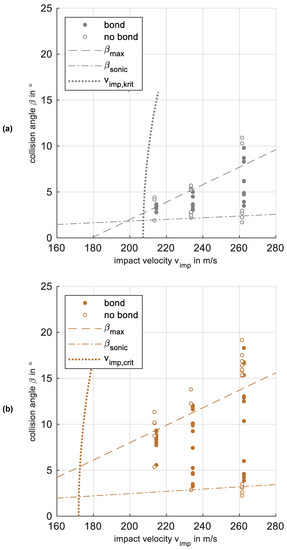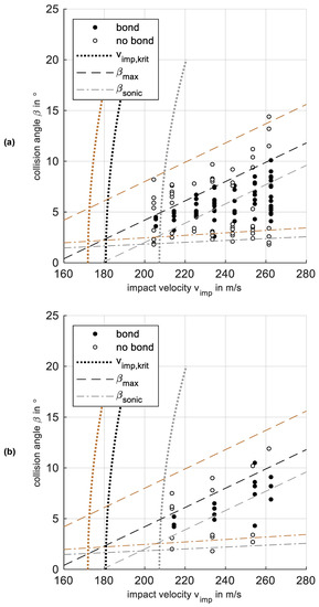 In previous studies, the minimum impact velocity to initiate bond formation for Al–Al was experimentally determined as 205 m s−1, which is close to the intersection of the upper boundary line (Equation (A2)) and the supersonic boundary curve (Equation (A1)), see Figure A1a and [20,21]. Furthermore, the empirical approximation for the minimum impact velocity by Wittman (Equation (1)) is close to this value, calculated as approximately 207 m s−1. The minimal impact velocities for Cu–Cu and Al–Cu have not yet been determined experimentally. Both can be estimated by the experimental results as described above. However, for Cu–Cu, the values of the intersections of the upper collision boundary line with the supersonic boundary curve (132 m s−1) and the empirical approximation for the minimum impact velocity by Wittman (172 m s−1) diverge. Thus, experimental verification is needed. For the dissimilar material combination Al–Cu, the intersection of the upper collision angle boundary and the minimal weldable collision angle boundary, which is higher than the supersonic limit of both materials and will be discussed below, occurs at about 185 m s−1. Wittman’s approach is not defined for a dissimilar material combination, but using the corresponding mean values of ultimate tensile strength and density of both materials delivers a suitable measure with 181 m s−1. However, this extended approximation has to be validated for other material combinations.