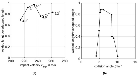 The ratio of welded to overlapped length of the samples for different impact velocities at a constant collision angle of approximately 5.0 m s−1 (a) and for different collision angles at a constant impact velocity of 262 m s−1 (b).