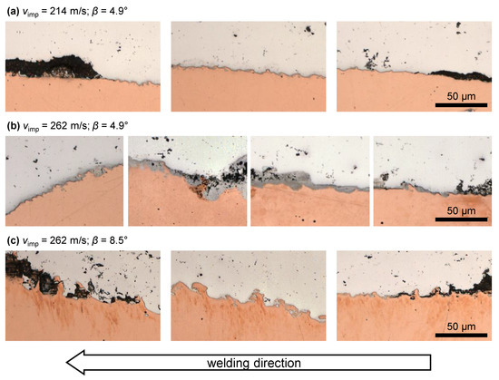 When the collision angle was increased to 8.5°, another unsteady type of weld interface occurred, as can be seen in Figure 5c. While at the beginning, the interface was similar to (a), it developed large waves with typical vortices and detachments. These waves continued even after the end of the weld, and particles of the mating material adhered to the surfaces as if it had first been welded and then separated. However, along the whole weld interface, no thick interlayer was visible or detected by the EDX.