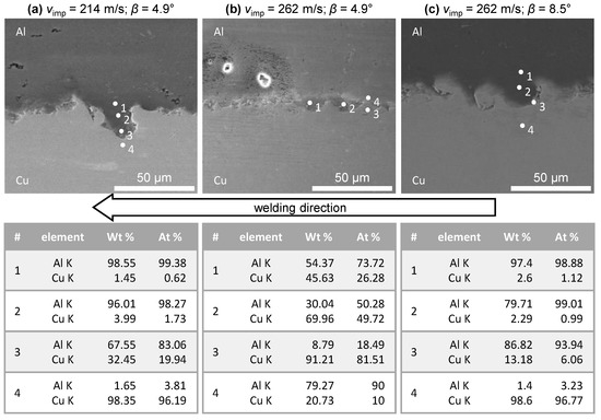 Regarding the microstructure of the weld, the micro sections revealed that the weld interface strongly differs depending on combination of the process parameters, even if one of them was kept constant, as can be seen in Figure 5. The weld interface of (a) (4.9° at 214 m s−1) was quite steady over the whole length with small and short waves. No transition layer was visible, even by this tilted preparation of the cross-section, as can be seen in Section 2.3. This was confirmed by EDX-analysis, which showed a distinct transition of element distribution at a representative location of the weld interface, as can be seen in Figure 6a.