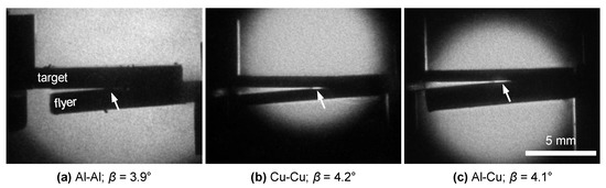 As for the lower collision angle boundary of the dissimilar material combination, the supersonic boundary was not responsible for the failed bond formation. However, previous studies revealed that the CoP, which is pushed ahead in the joining gap by the collision front, may prevent bond formation at small collision angles. In fact, the high roughness of the colliding surfaces can cause the CoP to be trapped by the collision front, inhibiting the particles from contacting the virgin base material [21,30,32]. However, since the EDX analysis did not detect any oxides, this is not the reason in the present study. However, the formation of large intermetallic phases at the weld interface in Figure 5b and the porous structure indicate excessive melting, which partially prevented bond formation. Recently, a correlation between the extent of the emitted light of the CoP and the temperature in the joining gap was shown [8]. Comparing the conditions in the welding gap close to the lower collision angle boundary, the CoP at the Cu–Cu and the Al–Cu configuration emitted a bright glow, which is not visible for Al–Al at the high-speed images, see Figure 7. The total kinetic energy of the experiments with Cu is higher due to the higher accelerated mass and it can be assumed that higher temperatures were reached in the collision zone for both Cu–Cu and Al–Cu. As the melting temperature of Al is distinctly lower than for Cu, the melting of Al can be expected in the latter configuration. Due to the mechanical concept of the model test rig, an estimation of the temperatures at the weld interface is possible. The following simplifications are assumed: