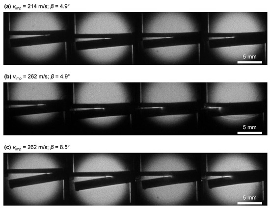 The model test rig concept provided good process observability. Therefore, a high-speed process observation was implemented by an image intensifier camera hsfc pro (by PCO, Kelheim, Germany) with a macro lens (Milvus Makro 100 mm f2 by Zeiss, Oberkochen, Germany) and a CAVILUX Smart lightning laser (power: 400 and wavelength: 640 nm, by Cavitar, Tampere, Finland). To determine the collision angle , a MATLAB script (version: 2018b, MathWorks, Natick, Massachusetts, MA, USA) with edge detection was applied to the high-speed images. More detailed information about the observation and image processing methods can be found in [9,20,21].