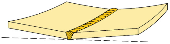 In butt-welded plates, angular distortion is the major problem and the most pronounced type of distortion [15]. It consists of a rotation of the structure around the welding line [13]. This distortion occurs in a butt joint when the transverse shrinkage is not uniform in the thickness direction [15,16]. When the angular distortion occurs, the welded component is distorted in angular directions around the weld interface [17,18], as sketched in Figure 2.