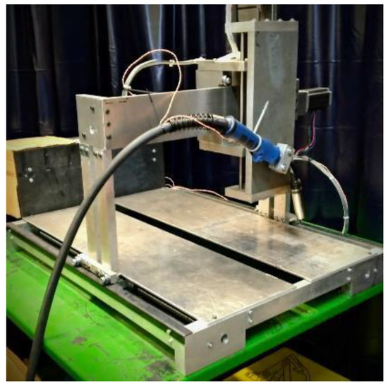 The equipment used to carry out the experiments was a welding machine model MIG 453 Modular, brand Electrex, and, to assure the precision of the welding, a numerical controlling equipment (Figure 3) developed in the Instituto Politécnico de Bragança was also used. This equipment is capable of moving the torch with three degrees of freedom and automatically operates the trigger of the welding machine by Code G programming in Grbl Controller 3.6.1 software.