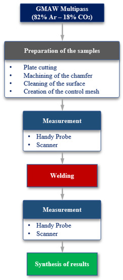 One of the chosen joining processes in the assembly and manufacture of many types of components is welding, and the main reasons for this choice are the velocity and reliability of the welding processes. In addition, the economic feasibility of the various types of welding compared to other manufacturing processes is another important motivation for its choice [1,2]. Gas Metal Arc Welding (GMAW) is a versatile welding method that is used in semi-automatic and fully automatic modes. It is the most utilized and preferred welding technique in the industry owing to its advantages, such as the capability of all position welding and good quality welds [3,4].