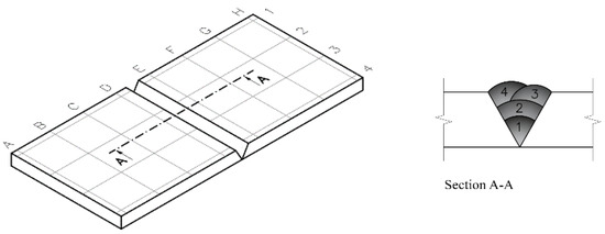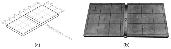 For this laboratory experiment, six pairs of S235JR steel sheets with dimensions of 110 × 100 × 10 mm were obtained with a V-groove as shown in Figure 6. For the analysis of distortions, a 30 × 30 mm control grid (Figure 7) with 32 nodes (measurement points) was created.