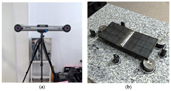 For data acquisition, was used the C-Track (Figure 9a) coordinate measurement equipment interconnected with HandyPROBE using the Metrolog X4 and VXelements. The arrangement for sample positioning to acquire data is shown in Figure 9b. Three support cylinders and four optical reflectors were placed on a granite surface plate following all the recommendations in the manufacturer’s manual.